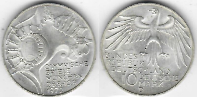 German Federal Republic 1972-D 10 Deutschemark, KM-133. Olympic stadium. Brilliant Uncirculated.