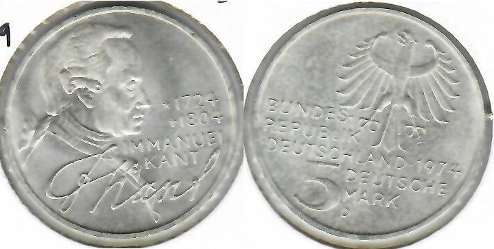 German Federal Republic 1974-D 5 Deutsche Mark, Immanuel Kant, KM-139