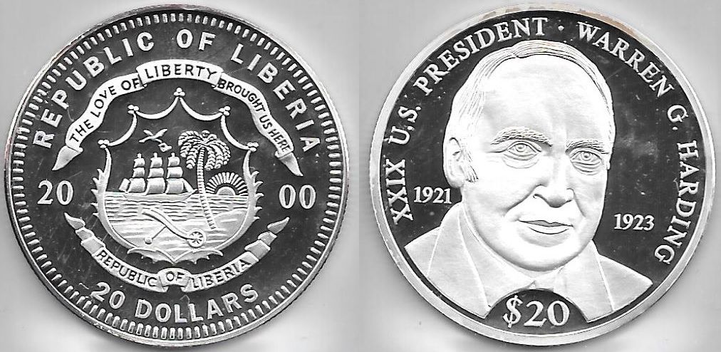 > LIBERIA 2000 20 Dollars, Bust of Warren G. Harding, KM-895