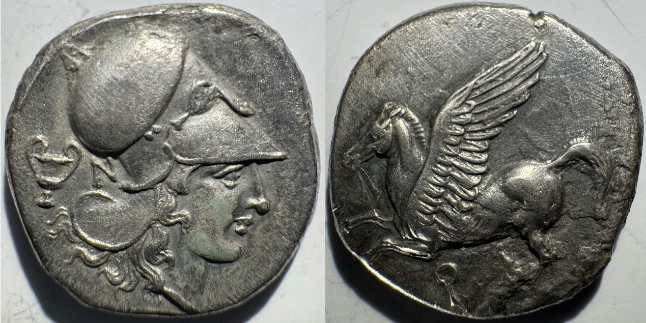 PELOPONNESOS: Corinth (345-307 BCE) Ar Stater (8.30g). Obv: Pegasus flying left, koppa (Q) below; Rev: Head of Athena Chalinitis (or Aphrodite) wearing Corinthian helmet right, amphora behind her head . Extremely Fine.